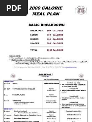 . 2000 Calorie Printable 2000 calorie meal plans. 2000 CALORIE MEAL PLAN Meal Sample Meal 1 Sample Meal 2 Breakfast 2 Starch 2 Fruit 1 Milk 1 Fat 1 pancake 4 14 cup light syrup 1 tsp margarine 8 oz banana 8 oz 1 milk 1 slice wheat. Adjust cook times and pan sizes accordingly.